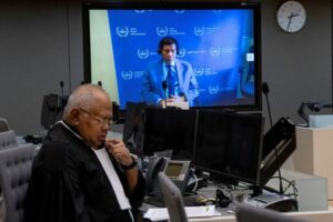 FILE PHOTO: Former Philippine President Rodrigo Duterte is seen on a screen in the courtroom of the International Criminal Court (ICC) with his lawyer Salvador Medialdea seated left, in The Hague, Netherlands, Friday, March 14, 2025. Peter Dejong/Pool via REUTERS//File Photo