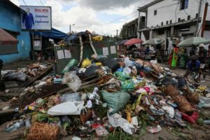 Waste accumulates due to a lack of collection near a campaign poster of Cameroon’s President Paul Biya, following opposition rejection of Biya’s election victory and allegations of fraud, amid violent protests, in Douala, Cameroon, October 29, 2025. REUTERS/Zohra Bensemra