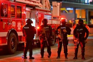 FOTO DE ARCHIVO: Agentes de policía montan guardia en el lugar donde explotó un vehículo frente a un centro comercial, tras hallarse un segundo vehículo con explosivos en las inmediaciones, que no llegó a detonar y fue neutralizado de inmediato, informó el ministro del Interior de Ecuador, John Reimberg, en Guayaquil, Ecuador. 14 de octubre de 2025. REUTERS/Vicente Gaibor del Pino/Archivo