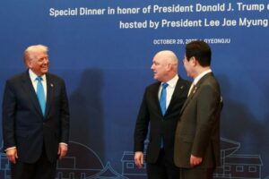 Der südkoreanische Präsident Lee Jae Myung begrüßt US-Präsident Donald Trump und den neuseeländischen Premierminister Christopher Luxon am Tag des Abendessens der Staats- und Regierungschefs der Asiatisch-Pazifischen Wirtschaftsgemeinschaft (APEC) in Gyeongju, Südkorea, am 29. Oktober 2025. REUTERS/Evelyn Hockstein