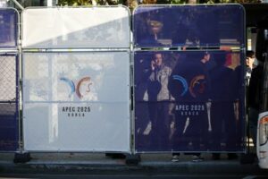 People stand behind fences bearing the logo of 2025 Asia-Pacific Economic Cooperation leaders’ summit, at the venue for the summit in Gyeongju, South Korea, October 28, 2025. REUTERS/Kim Hong-Ji