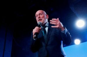 Dutch GroenLinks-PvdA leader Frans Timmermans delivers a speech and announces he is stepping down as the leader of the party following results during the Dutch parliamentary election in the GroenLinks-PvdA (Partij van de Arbeid) venue, in Rotterdam, Netherlands, October 29, 2025. REUTERS/Geert Vanden Wijngaert