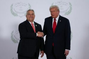 U.S. President Donald Trump and Hungarian Prime Minister Viktor Orban shake hands in Sharm el-Sheikh, Egypt, October 13, 2025. REUTERS/Suzanne Plunkett/Pool