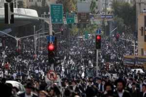 Thousands of Ultra-Orthodox Jews gather on the day they rally in a “million man” protest against Israeli military conscription in Jerusalem October 30, 2025. REUTERS/Ammar Awad
