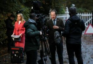 Members of the media work outside the entrance to the Royal Lodge, a large property on the estate surrounding Windsor Castle, where Andrew, the younger brother of Britain’s King Charles lives, in Windsor, Britain, October 31, 2025. Britain’s King Charles has stripped his younger brother Andrew of his title of prince and forced him out of his Windsor home, Buckingham Palace said on Thursday, seeking to distance the royals from him over his links to the Jeffrey Epstein scandal. REUTERS/Suzanne Plunkett