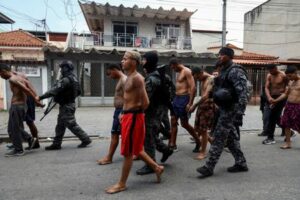 Members of the military police special unit detain suspected drug dealers during a police operation against drug trafficking at a favela in the Penha slum complex, in Rio de Janeiro, Brazil October 28, 2025. REUTERS/Aline Massuca