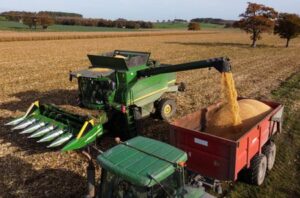 FOTO DE ARCHIVO: Un agricultor cosecha su campo de maíz en Guemene-Penfao, cerca de Nantes, Francia, 18 de noviembre de 2021. Imagen tomada con un dron. REUTERS/Stephane Mahe/Archivo