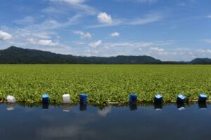 Imagen de archivo. Contenedores de plástico colocados para frenar el avance de la lechuga de agua (Pistia stratiotes), una planta invasora que dificulta la navegación y la pesca, del embalse El Cerron Grande, en Suchitoto, El Salvador. 10 de septiembre de 2025. REUTERS/José Cabezas