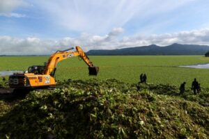 Imagen de archivo. Soldados salvadoreños utilizan una excavadora para retirar lechuga de agua (Pistia stratiotes), una planta invasora que dificulta la navegación y la pesca, del embalse El Cerron Grande, en Suchitoto, El Salvador. 10 de septiembre de 2025. REUTERS/José Cabezas