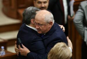 Moldova’s newly appointed Prime Minister Alexandru Munteanu receives congratulations from incumbent Prime Minister Dorin Recean following a parliamentary vote in Chisinau, Moldova, October 31, 2025. REUTERS/Vladislav Culiomza