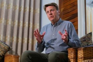 Tom Palmer, Chief Executive Officer (CEO), Newmont Corporation, speaks with Reuters’ journalists after the official opening of the Newmont Ghana Gold Limited, Ahafo North Mine, in Kenyasi, Ahafo Region, Ghana. October 30, 2025. REUTERS/Francis Kokoroko