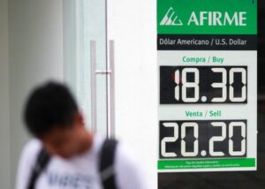 FOTO DE ARCHIVO. Un hombre pasa junto a una pizarra que muestra los tipos de cambio del peso mexicano frente al dólar estadounidense, en un banco de Ciudad de México, México. 6 de agosto de 2024.REUTERS/Henry Romero