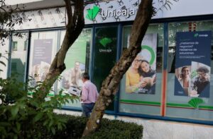 FOTO DE ARCHIVO: Un hombre pasa junto al nuevo logotipo de Unicaja, recientemente instalado en la fachada de una sucursal bancaria de Unicaja, en Ronda, España, el 5 de noviembre de 2024. REUTERS/Jon Nazca