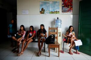 Mujeres y niños indígenas sentados en una sala de espera durante una misión de investigadores del instituto brasileño de salud pública Fiocruz para investigar los trastornos de salud entre los indígenas Munduruku que están potencialmente relacionados con la contaminación por mercurio causada por la minería ilegal de oro, en la aldea Sai Cinza, en el municipio de Jacareacanga, estado de Pará, Brasil 19 de febrero de 2025. REUTERS/Adriano Machadoo
