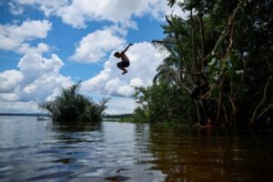 Niños Munduruku juegan en el río Tapajos durante una misión de investigadores del instituto brasileño de salud pública Fiocruz para investigar los trastornos de salud entre los indígenas Munduruku que están potencialmente relacionados con la contaminación por mercurio causada por la minería ilegal de oro, en la aldea Sai Cinza, en el municipio de Jacareacanga, estado de Pará, Brasil 20 de febrero de 2025. REUTERS/Adriano Machado