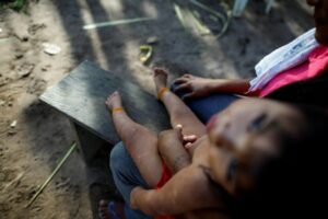 Yane Akay sostiene a su hija, Rany Ketlen, dentro de su choza durante una misión de investigadores del instituto brasileño de salud pública Fiocruz para investigar los trastornos de salud entre los indígenas Munduruku que están potencialmente relacionados con la contaminación por mercurio causada por la minería ilegal de oro, en la aldea Sai Cinza, en el municipio de Jacareacanga, estado de Pará, Brasil 19 de febrero de 2025. REUTERS/Adriano Machado