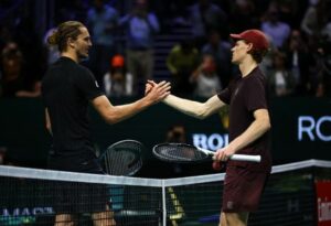 El tenista italiano Jannik Sinner (derecha) estrecha la mano del alemán Alexander Zverev tras ganar su partido de semifinales del ATP Masters 1000 de París en el Paris La Defense Arena de Nanterre, Francia. 1 de noviembre de 2025 REUTERS/Sarah Meyssonnier
