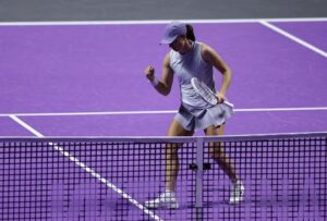 La tenista polaca Iga Swiatek reacciona durante su partido de la fase de grupos contra la estadounidense Madison Keys por las WTA Finals en el King Saud University Indoor Arena de Riad, Arabia Saudita. 1 de noviembre de 2025. REUTERS/Hamad I Mohammed
