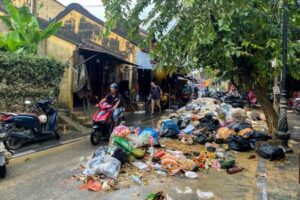 A person rides a vehicle past debris following floods in central Vietnam that have killed several people, in Hoi An, Vietnam, November 1, 2025. REUTERS/Thinh Nguyen