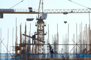 A Vanke sign is seen above workers working at the construction site of a residential building in Dalian, Liaoning province, China September 16, 2019. REUTERS/Stringer