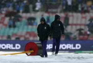 Cricket – ICC Women’s World Cup – Final – India v South Africa – DY Patil Stadium, Navi Mumbai, India – November 2, 2025 Ground staff on the pitch as rain delays the start of play REUTERS/Francis Mascarenhas