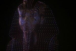 A drone light show depicts the mask of ancient pharaoh king Tutankhamen during the opening ceremony of the Grand Egyptian Museum (GEM), near the Giza pyramid complex, in Giza, Egypt, November 1, 2025. REUTERS/Mohamed Abd El Ghany