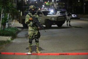 FOTO DE ARCHIVO: Miembros del ejército mexicano vigilan frente a la oficina de la unidad antisecuestros de la Procuraduría General de la República en Tijuana tras un ataque improvisado con drones atribuido a un grupo criminal local, en Tijuana, México, 15 de octubre de 2025. REUTERS/Jorge Dueñas