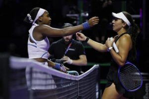 La tenista estadounidense Jessica Pegula celebra tras ganar su partido de la fase de grupos contra su compatriota Coco Gauff en las WTA Finals en el King Saud University Indoor Arena de Riad, Arabia Saudita. 2 de noviembre de 2025 REUTERS/Hamad I Mohammed