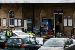 A police officer stands guard at Huntingdon Station following a series of stabbings on a train, near Cambridge, Britain, November 2, 2025. REUTERS/Jack Taylor