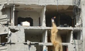 A Palestinian youth clears out debris from a heavily damaged building, amid a ceasefire between Israel and Hamas, in Gaza City, November 2, 2025. REUTERS/Mahmoud Issa