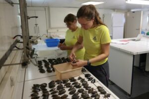 Investigadores a bordo del buque del Centro Helénico de Investigación Marina (HCMR) limpian y clasifican mejillones utilizados como bioindicadores para controlar la contaminación microplástica y química, incluidos metales pesados y contaminantes orgánicos, durante una misión en el Golfo Sarónico, Grecia, 8 de septiembre de 2025. REUTERS/Stelios Misinas