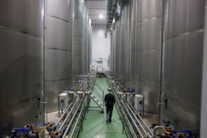 A worker walks between tanks filled with olive oil at the Spanish olive oil producer Dcoop’s factory in Antequera, Spain, April 9, 2025. REUTERS/Jon Nazca