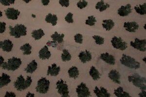 FILE PHOTO: A drone view shows a tractor moving through an olive grove, in Herrera, Spain, July 22, 2025. REUTERS/Leonardo Benassatto/File Photo