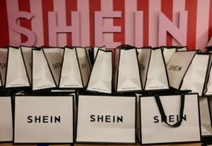 A company logo for fashion brand Shein is seen on a pile of gift bags on its Christmas bus as part of a nationwide promotional tour in Liverpool, Britain, December 14, 2024. REUTERS/Phil Noble