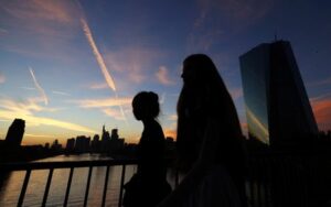 ARCHIV: Die Sonne geht hinter der Skyline unter, während eines warmen Herbstabends in Frankfurt, Deutschland, am 1. Oktober 2023. REUTERS/Kai Pfaffenbach