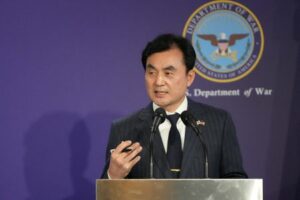 South Korean Defense Minister Ahn Gyu-Back, speaks during the joint press conference with U.S. Defense Secretary Pete Hegseth, following the 57th Security Consultative Meeting at the Defense Ministry in Seoul, South Korea, Tuesday, Nov. 4, 2025. Lee Jin-man/Pool via REUTERS