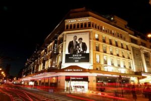 A view of a giant poster with a photo of Donald Tang, Executive Chairman of Shein Group, and Frederic Merlin, Chairman of the SGM Group – Department Stores Company and head of BHV, on the facade of the Bazar de l’Hotel de Ville, Le BHV Marais department store, ahead of the opening of Chinese fast-fashion retailer’s fast fashion first permanent shop in Paris, France, November 3, 2025. REUTERS/Abdul Saboor