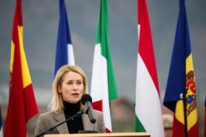 La Alta Representante de la UE para Asuntos Exteriores y Política de Seguridad y Vicepresidenta de la Comisión Europea, Kaja Kallas, se dirige a los soldados durante una visita a la base de EUFOR (Fuerzas de la Unión Europea en Bosnia y Herzegovina) en Sarajevo, Bosnia y Herzegovina. 3 de noviembre de 2025. REUTERS/Amel Emric