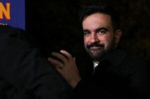 Der demokratische Kandidat für das Amt des Bürgermeisters von New York City, Zohran Mamdani, blickt zu, während er am Vorabend des Wahltags eine Wahlkampfkundgebung abhält, im Stadtteil Queens in New York City, USA, am 3. November 2025. REUTERS/Shannon Stapleton