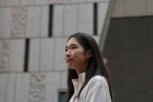 Hong Kong Olympic gold medallist Vivian Kong looks on as she speaks to the media before submitting her nomination form to run for the tourism functional constituency in the Legislative Council election, in Hong Kong, China, November 3, 2025. REUTERS/Tyrone Siu