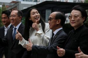 Hong Kong Olympic gold medallist Vivian Kong reacts as she poses for photos before submitting her nomination form to run for the tourism functional constituency in the Legislative Council election, in Hong Kong, China, November 3, 2025. REUTERS/Tyrone Siu