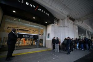 People queue to enter the Le BHV Marais department store, the Bazar de l’Hotel de Ville, on the day of the opening of the first physical space of Chinese online fast-fashion retailer Shein within the Parisian department store, in Paris, France, November 5, 2025. REUTERS/Sarah Meyssonnier