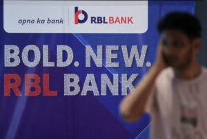A man walks past a banner during a press conference announcing Emirates NBD’s plan to acquire a majority stake in RBL Bank Limited, in Mumbai, India October 19, 2025. REUTERS/Francis Mascarenhas