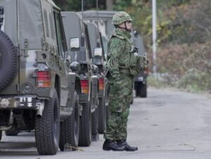 A member of Japan Self-Defense Forces (JSDF) stands next to military vehicles during a practice setting up a bear trap in Kazuno, Akita Prefecture, Japan, November 5, 2025. REUTERS/Tom Bateman