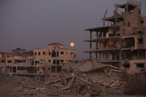 La superluna de Beaver Moon se eleva por encima de edificios destruidos en medio de un alto el fuego entre Israel y Hamás, en la ciudad de Gaza, 5 de noviembre de 2025. REUTERS/Dawoud Abu Alkas