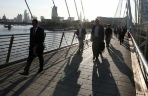 Workers walk across the Golden Jubilee Bridges during the morning rush hour as London Tube rail strikes continue, in London, Britain, September 8, 2025. REUTERS/Toby Melville