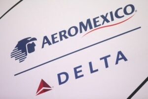 FOTO ARCHIVO: Logotipos de Aeroméxico y Delta Airlines aparecen durante un evento de lanzamiento de la nueva alianza entre ambas aerolíneas en Ciudad de México, México. 3 de mayo de 2017. REUTERS/Edgard Garrido/Foto de archivo