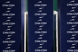 Logos of CMA-CGM shipping company are seen during the Viva Technology conference dedicated to innovation and startups at Porte de Versailles exhibition center in Paris, France, June 12, 2025. REUTERS/Benoit Tessier