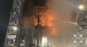 Firefighters work to put out a fire at the Naftan oil refinery in Novopolotsk, Belarus, in this still image taken from a video released November 6, 2025. Belarus Emergency Ministry/Handout via REUTERS