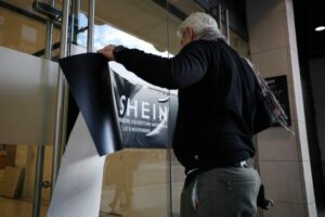 A employee sticks a banner with the Shein logo on a glass door of the Le BHV Marais department store, the Bazar de l’Hotel de Ville, on the day of the opening of the first physical space for Chinese online fast-fashion retailer Shein within the Parisian department store, in Paris, France, November 5, 2025. REUTERS/Sarah Meyssonnier